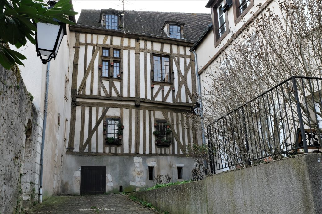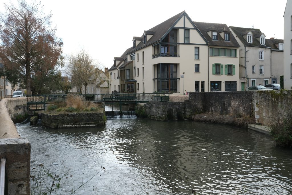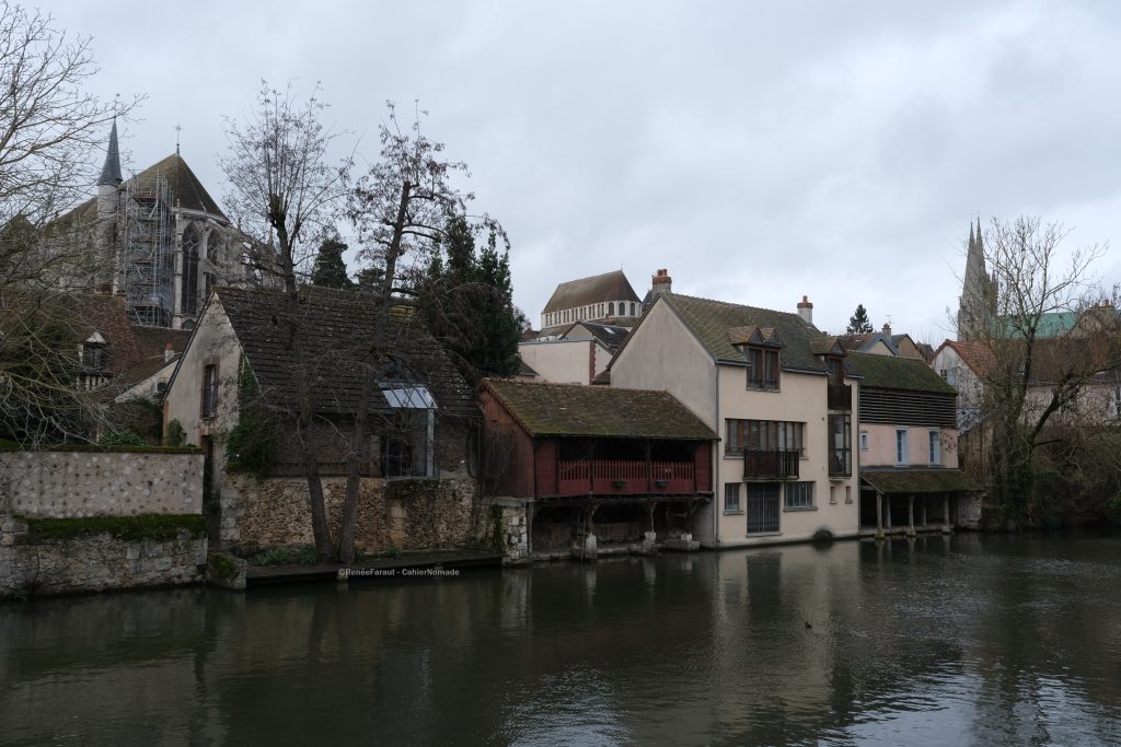 Des escaliers à l’arrière de la cathédrale permettent de rejoindre les bords de l’Eure et la ville basse. En bas des escaliers se trouvent des ruelles pavées, bordées de maisons à colombages, des ruelles aux noms souvent évocateurs de ce qui se trouvait là autrefois : ainsi la rue aux écuyers où se trouvaient les écuries du château ou encore la rue du Massacre, lieu d’un ancien abattoir. La rue aux Çois est ma préférée, c’est un petit passage qui serpente entre de hautes maisons. Quant aux Çois, le nom viendrait des charpentiers qui travaillaient ici.