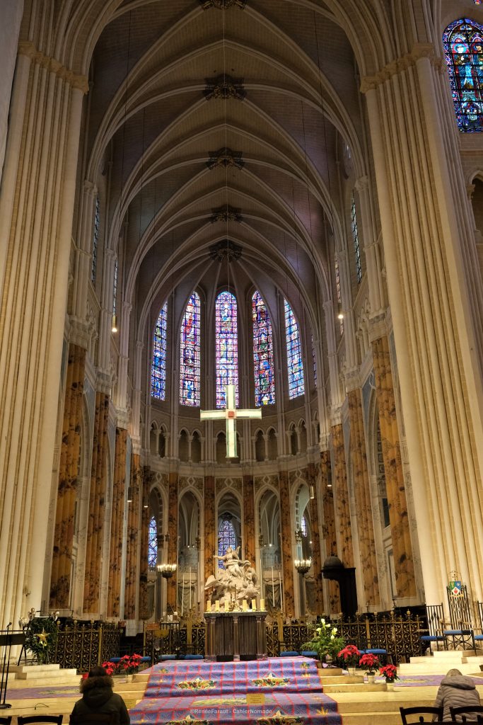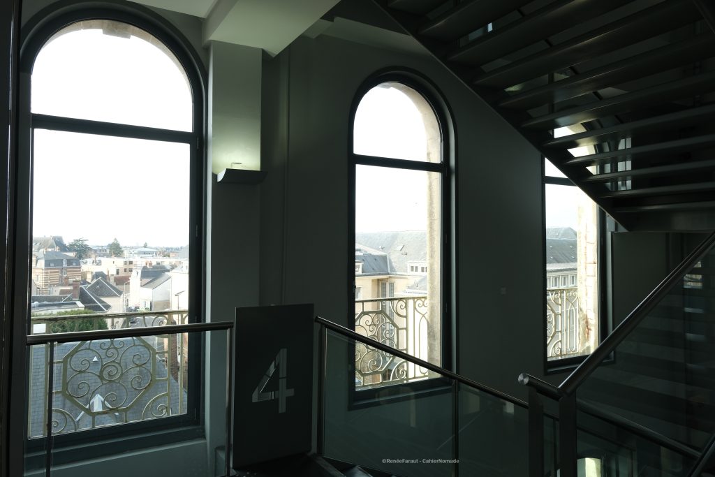 Pour ce point de vue, rendez-vous à l’ancien hôtel des Postes, tout proche de la place des Épars, construit au début du 20ᵉ siècle. Il possède un beau beffroi, orné d’encorbellements et de mosaïques racontant le parcours d’une lettre. Le bâtiment accueille aujourd’hui la médiathèque et a été rebaptisé l’Apostrophe. Je vous conseille vivement d’aller y faire un tour. L’intérieur est baigné de lumière et invite à la lecture. Mais pas que. Montez au dernier étage et vous découvrirez un point de vue sur la cathédrale.